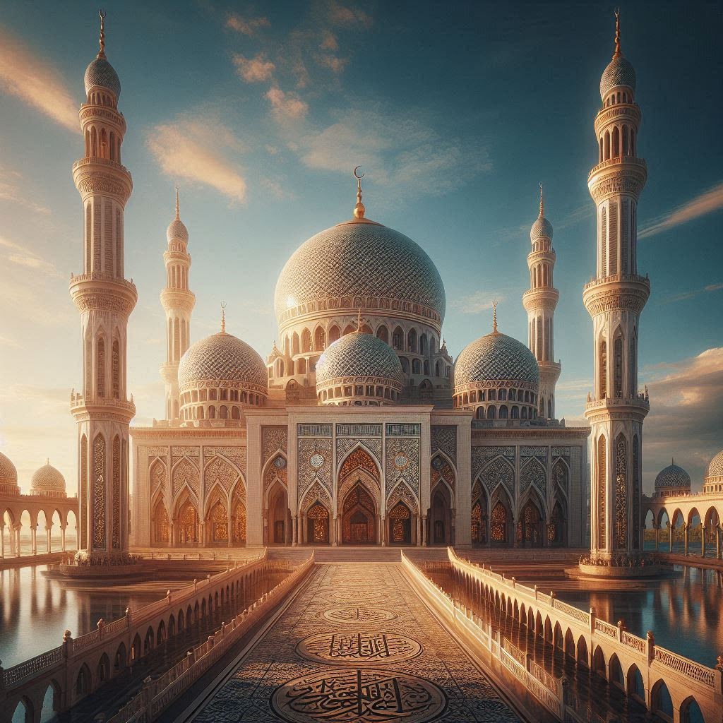 # The image portrays a grand mosque with three tall minarets and a large central dome under a clear blue sky. The intricate architecture includes multiple arches and windows reflecting sunlight. A long walkway leads to the main entrance, adorned with ornate calligraphy and decorative tilework, conveying a sense of tranquility and majesty.
